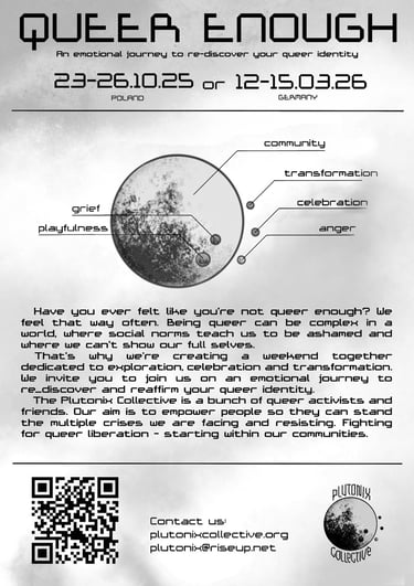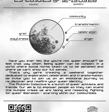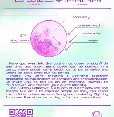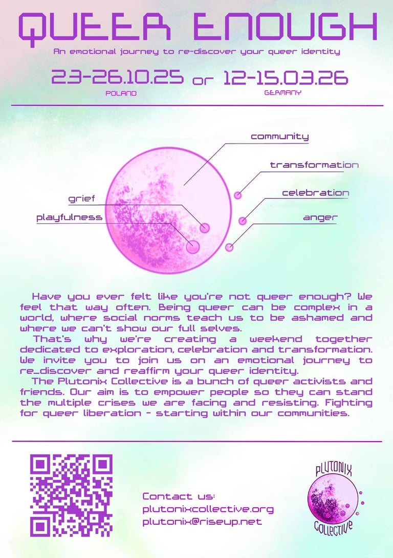 Have you ever felt like you're not queer enough? We feel that way often. Being queer can be complex in a world, where social norms teach us to be ashamed and where we can't show our full selves. That's why we're creating a weekend together dedicated to exploration, celebration and transformation. We warmly invite you to join us on an emotional journey to re_discover and reaffirm your queer identity.